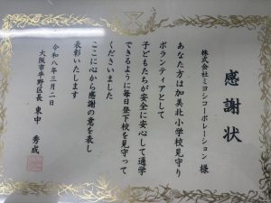 弊社では交通安全見守り運動をボランティアでさせて頂いております。